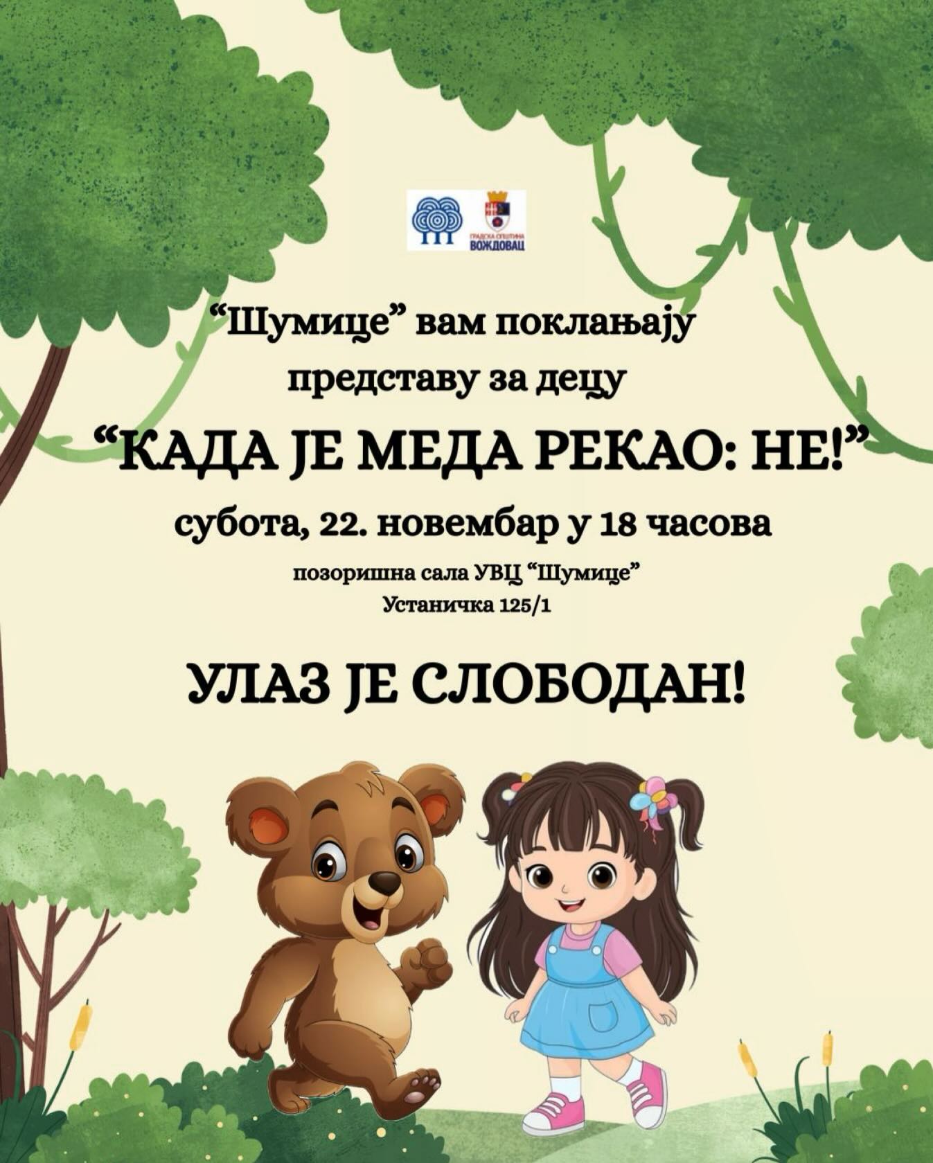 У суботу, 22. новембра у 18 часова у позоришној сали УВЦ „Шумице“,(Устаничка 125/1) одиграће се бесплатна дечја представа „Када је меда рекао: „НЕ!“.