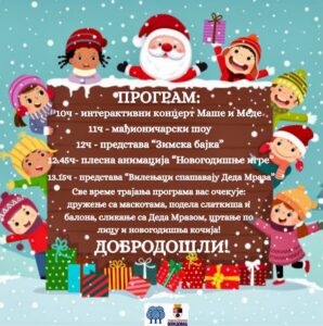 У недељу, 22. децембра од 10:00 до 14:00 часова у УВЦ “Шумице”, (Устаничка 125/1) најмлађи посетиоци имаће прилику да уживају у занимљивом и разноврсном програму, да се друже са маскотама и аниматорима, погледају представу, играју, певају и сликају се са Деда Мразом у новогодишњој кочији.